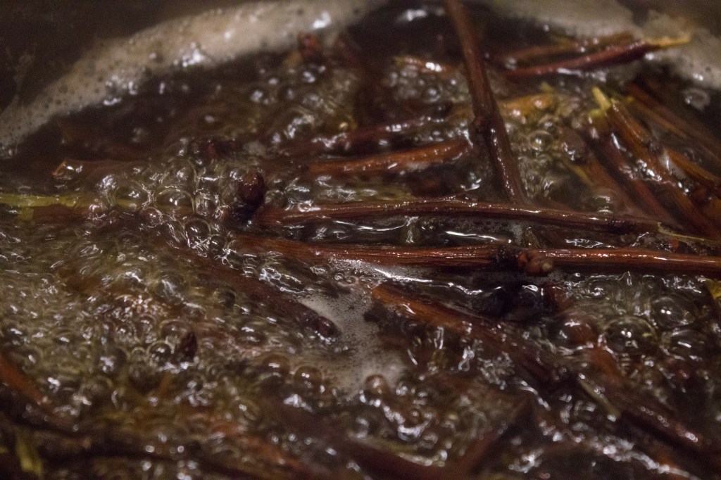 2.) Izberemo primerno velikost posode, vanjo položimo vejice in dolijemo toliko vode, da so vejice popolnoma pokrite z vodo. V vodo lahko dodamo tudi nekaj za činčile varnih zelišč, saj te les dodatno obogatijo z okusom. Vodo zavremo, vejice tako kuhamo 15-20 minut. Vejice odcedimo in vsako posebej odrgnemo z gobico ali zobno ščetko in s tem odstranimo še več umazanije; lišaje in iztrebke. Ta korak ponavljamo, dokler voda, v kateri kuhamo les, ni čista (bistra, rahlo obarvana). Pozorni moramo biti, da les dobro sčistimo, saj bi drugače naš hišni ljubljenček vso umazanijo zaužil. Naše činčile žal nimajo takšnega imunskega sistema tako kot njihovi divji predniki, zato je bolje, da les pravilno sčistimo in obdelamo.