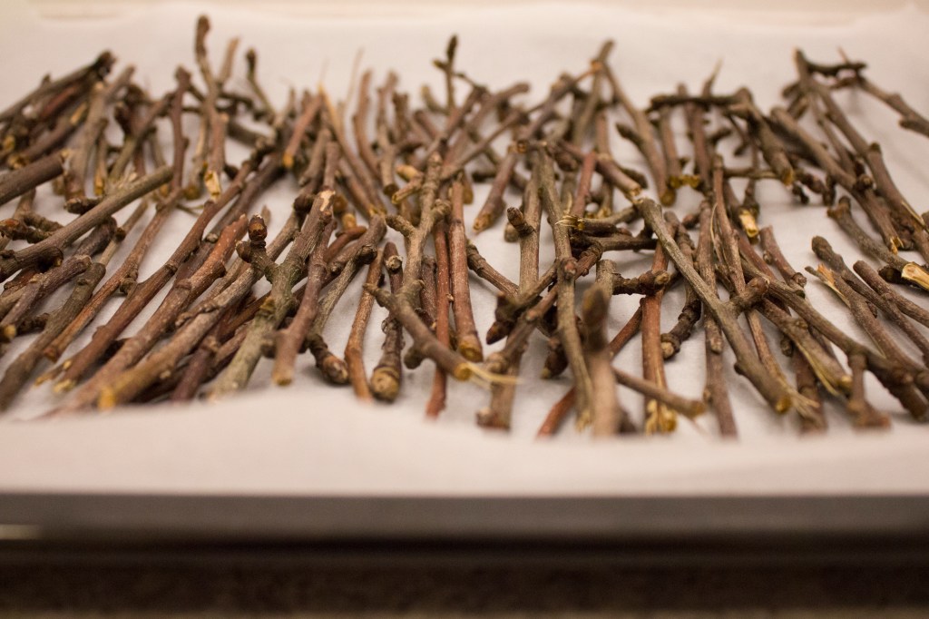 1.) Vejice razrežemo na želeno velikost. Priporočava dolžino med 5 in 10 cm. Razvite popke in listje odstranimo. Pomembno je, da odstranimo umazanijo, ki jo lahko opazimo na zunanjosti lesa, med drugim zemljo, prah, iztrebke živali in žuželke.